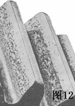 圖11中的麻點(diǎn)在螺旋面的外端(此圖中齒輪的右邊)開始,原因是中心線稍有失調(diào),麻點(diǎn)慢慢地向齒的中部進(jìn)展最后停止進(jìn)展,表面開始拋光,表示載荷沿齒面分配變得更均勻了.這種麻點(diǎn)是無(wú)害的。