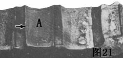 圖21是在齒輪的若干齒上,由于重復(fù)的重載荷引起的斷折的情況。標(biāo)有“A”字的齒看來(lái)是由于疲勞裂紋首先折斷的(注意光滑、似夭鵝絨般的地帶)。