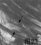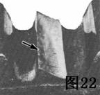 圖22是另一疲勞斷折的情況。箭頭指明裂紋在斷折處左邊緣開始,那里有一個(gè)小坑,靠近齒受壓側(cè)嚙合區(qū)的底部。緊靠裂源(箭頭指處)旁的地區(qū)受到充分的磨擦,說(shuō)明裂紋起初發(fā)展緩慢。
