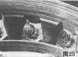 圖24中行星齒輪的大部分齒頂已碎掉。作業(yè)載荷產(chǎn)生的應(yīng)力在這個(gè)點(diǎn)引起裂紋。最后,可能是由于疲勞,這些裂紋繼續(xù)發(fā)展,直到齒的表面。如果這是在短的使用之后發(fā)生的,可能表面硬化深度過(guò)大,需要作金相檢查來(lái)作出判斷。